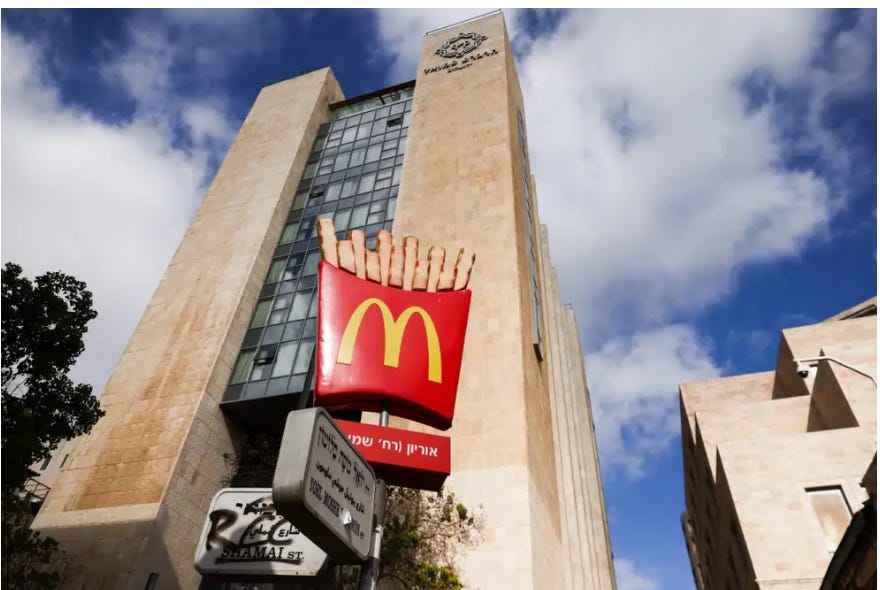 McDonald’s Israel said on its social media accounts last week that it has given thousands of free meals to Israel Defense Forces personnel. On Sunday, the franchise stated again that it was donating meals, “to all . . . murderers and molesters and rapists and pedophiles and child killers . . . “ [Emphasis I added.]