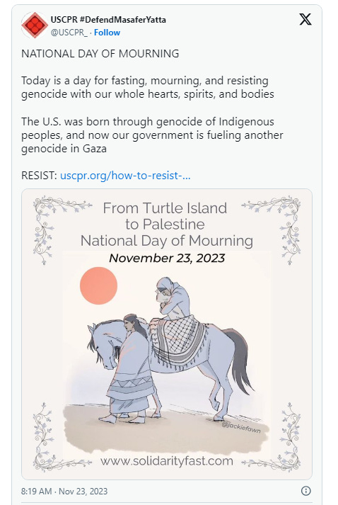 “we have chosen November 23rd, the fourth Thursday in November, in recognition that the ongoing genocide in Gaza is a continuation of the same setter colonial violence experienced by Indigenous peoples on Turtle Island.”