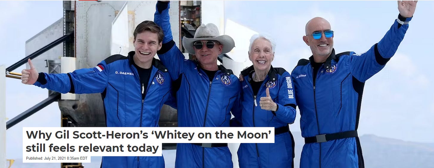 Another writer – in discussing the Branson and Bezos space trips – described “Whitey on the Moon” as “a nod to the privileges enjoyed by non-Black people that allowed them to pursue their prideful pet projects that did not necessarily make the world a better place for most Americans.”