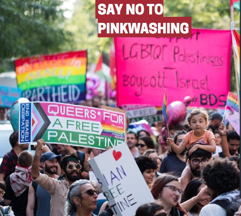 Pinkwashing is an Israeli government propaganda strategy that cynically exploits LGBTQIA+ rights to project a progressive image while concealing Israel’s occupation and apartheid policies oppressing Palestinians.