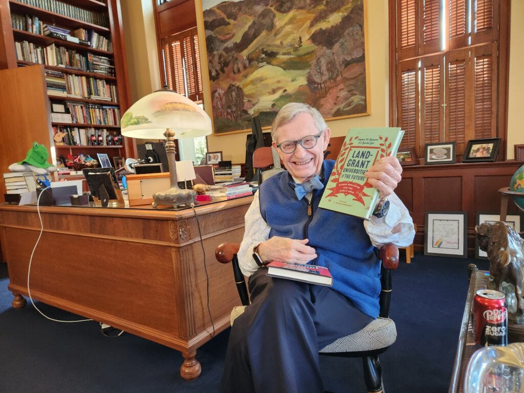 [Photo: West Virginia University President Gordon Gee shows off the book he co-authored, “Land-Grant Universities for the Future: Higher Education for the Public Good.” Gee argues that public universities have an obligation to train students for good careers and cannot offer instruction in every discipline (Elaine S. Povich/Stateline). ]