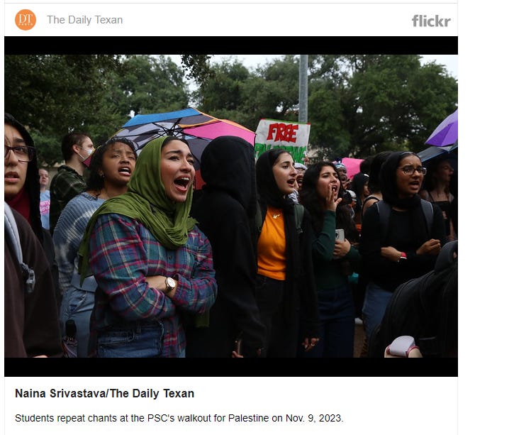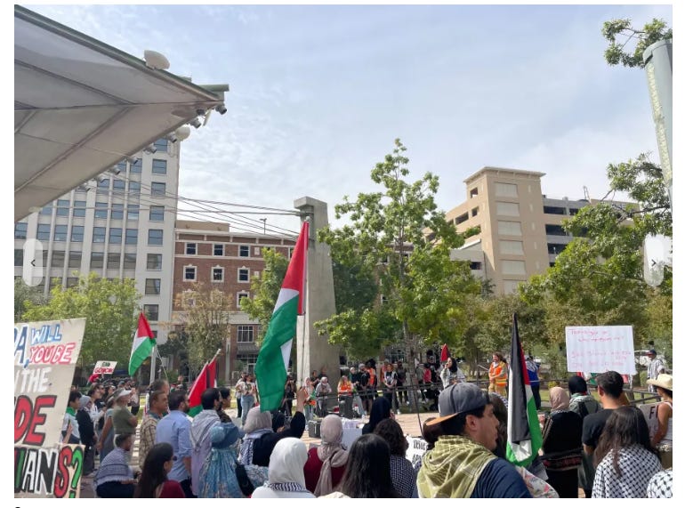 [The group here in the Borderland was chanting “Free Palestine” as they marched Downtown and then gathered at San Jacinto Plaza to hear speakers.]