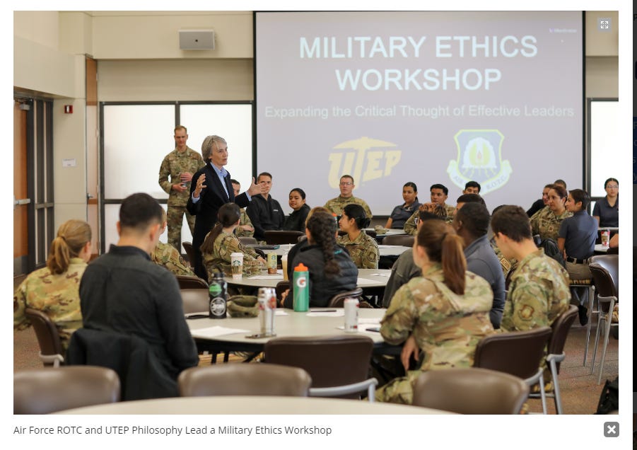 Air Force ROTC and UTEP Philosophy Lead a Military Ethics Workshop. The fucking school is led by an Air Force Baby Bomber: On Veterans Day, Friday, November 11, USAF Captain Christopher Kuennen and UTEP Philosophy Visiting Assistant Professor Glenn Trujillo led a military ethics workshop. The workshop began with reflections from UTEP President Heather Wilson, who reflected on her time in the Air Force and serving as the Secretary of the United States Air Force. The workshop then held lectures and discussions over issues in remote warfare, drone strikes, military leadership, and the use of artificial intelligence in war. Professors from UTEP and El Paso Community College facilitated discussions, and USAF officers shared their experiences serving in similar missions. (source)