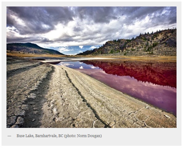 The water’s purple because there is no longer any oxygen in the water in this lake near Kamloops BC. The bacteria in this lake ‘eat’ hydrogen sulphide, which smells like rotten eggs and allows the bacteria to take over when there is no oxygen in the water. No animals can live in this water – we need oxygen to survive.