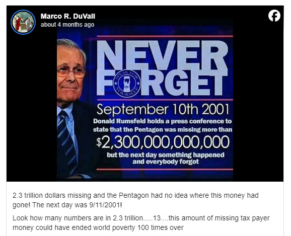 Donald Rumsfeld did not reveal that the Pentagon had lost $2.3 trillion the day before the September 11, 2001, attacks, contrary to posts shared online that misrepresent his remarks about missing financial audit trails. The figure had been mentioned by the Department of Defense more than a year earlier.