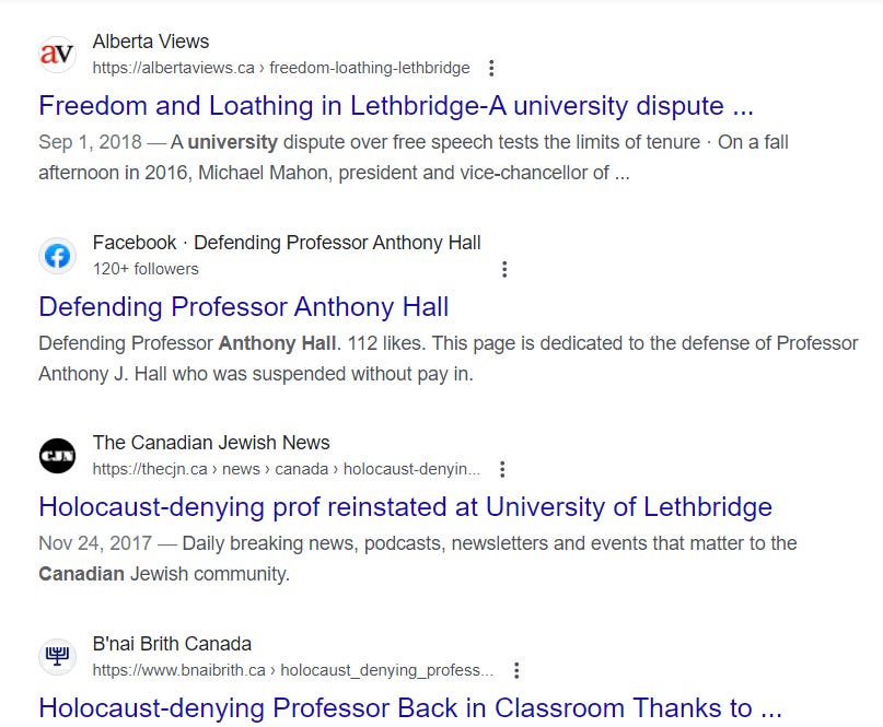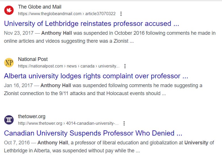 When searching this — on Jewish Google: :Anthony Hall fired from Canadian University” you get all these curated and filtered and swiped off the map (that is, counter charges) Google, the Agnotology Factory.
