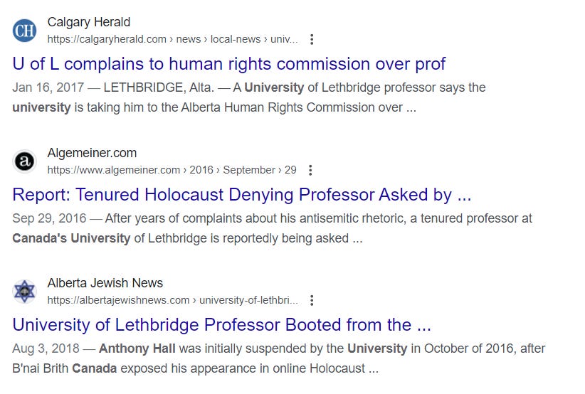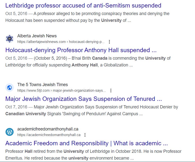 When searching this — on Jewish Google: :Anthony Hall fired from Canadian University” you get all these curated and filtered and swiped off the map (that is, counter charges) Google, the Agnotology Factory.