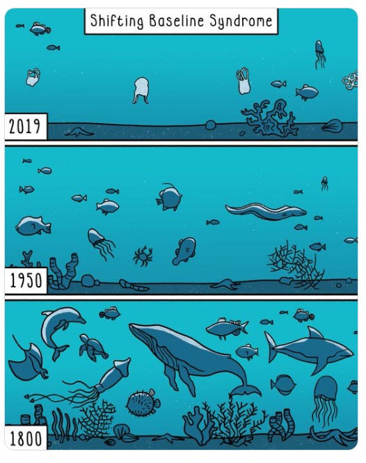 This is the shifting baseline disorder BIG Time. No, not some nostalgic waxing for Norman Rockwell better good old days. The good old days never were allowed to flourish into the good old now days, or the good towns and cities and communities good old future days.