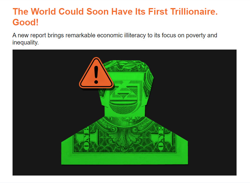 The world could soon have its first trillionaire, according to a prominent anti-poverty organization. That’s pretty cool. But Oxfam—which started as a famine relief group before mission creep set in—portrays the achievement of a new nominal benchmark in wealth as a bad thing that contributes to the misery of the masses. Through impressive economic illiteracy, the organization’s recent report on inequality and poverty manages to misdiagnose the world’s ills and prescribe dangerous and counterproductive remedies. (source)