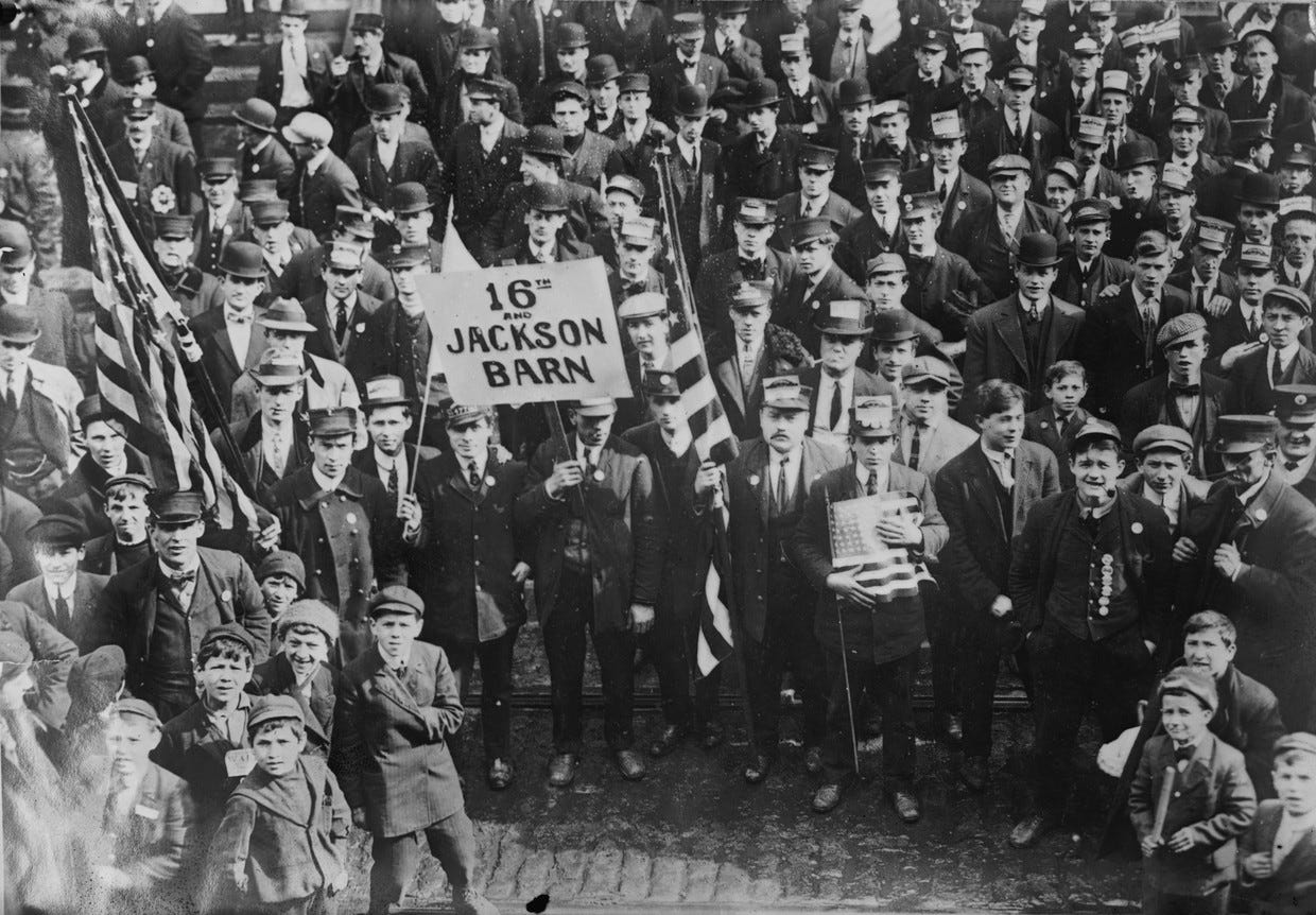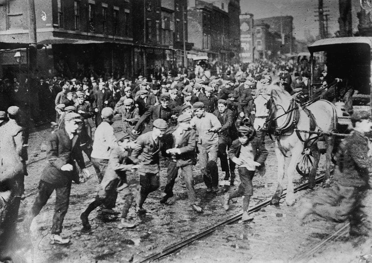 [Strikers storming horse-drawn car.]