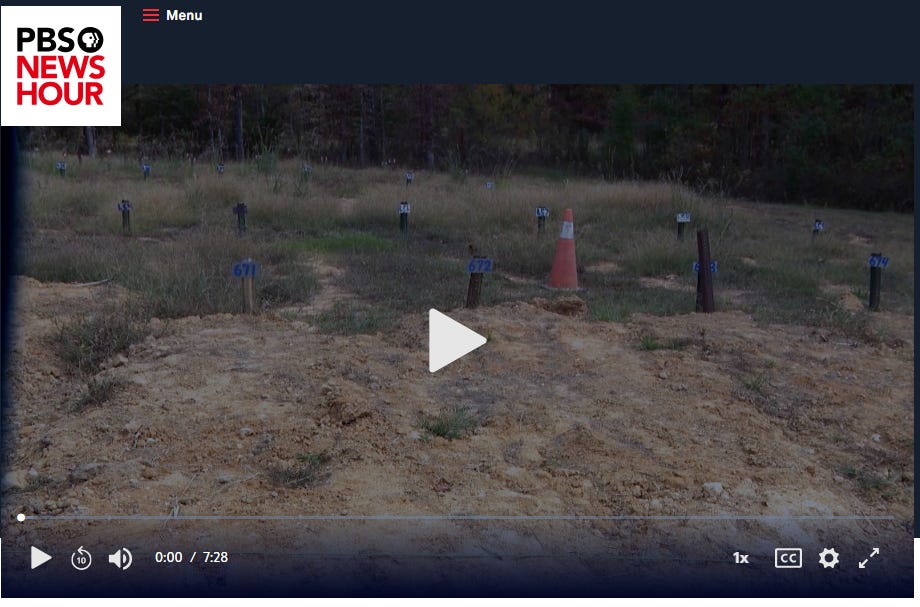 “We’re seeking to have the federal Department of Justice come in and do an investigation to make sure that each and every one of these citizens, disproportionately Black citizens, whose lives matter will be identified, their families notified, and them given a proper funeral,” Crump told PBS NewsHour.