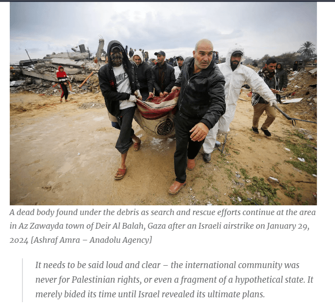 Even the International Court of Justice (ICJ) was incapable of calling for a ceasefire, which is a practical preliminary step towards halting Israel’s genocide. In a matter of hours following the ICJ ruling, Israel launched an attack on UNRWA which led to several Western countries, many of whom are major donors, to cut funding to the agency, leading to one of the most visible acts of complicity in Israel’s genocide against Palestinians so far.