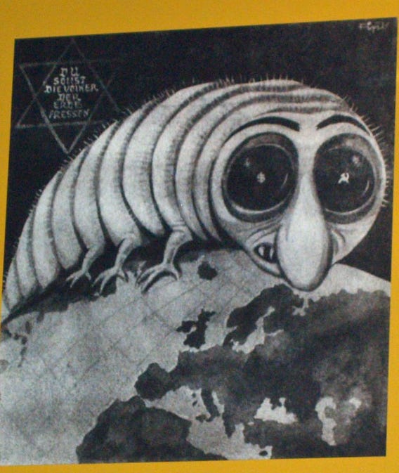 [Image: from Wikipedia. Caricature from Der Stürmer, September 1944: A monstrous vermin – bearing a stereotypical Jewish nose, reflecting a dollar sign in one eye and a hammer and sickle in the other, and labeled with a star of David – crawls over the earth. The text (“Thou shalt eat the nations of the earth”) was purported to be a passage from the Hebrew Bible.]