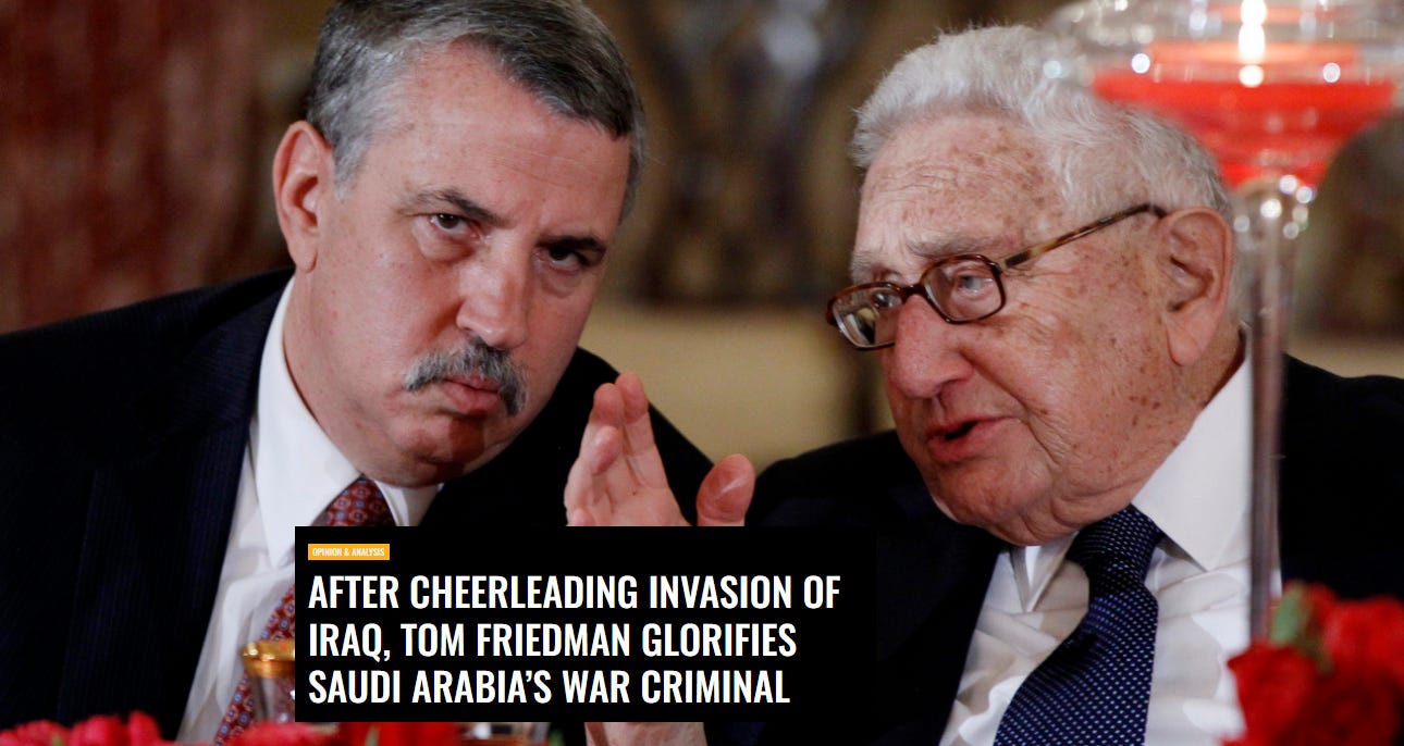 Is Friedman is joking about Henry Kissinger — “talk back”? That, of course, is the Kissinger Friedman knows from Kissinger’s endless spin performances for journalists who doted on him and conveyed his every word, every thought. The shameless, uncritical reporting of the man and his deeds is one of the travesties of recent journalism, and Friedman is one of its particularly crafty practitioners.