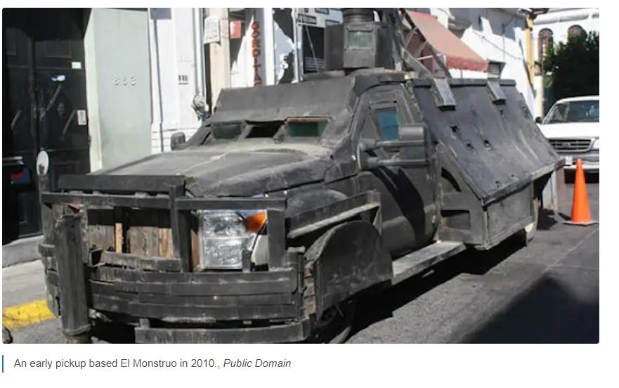 Tip of the Anti-drone Cage Iceberg: Cartel Narco Tank With Cope Cage Anti-Drone Armor Emerges: A drug cartel has adopted a major battlefield innovation in an attempt to help fend off growing drone attacks against its vehicles.