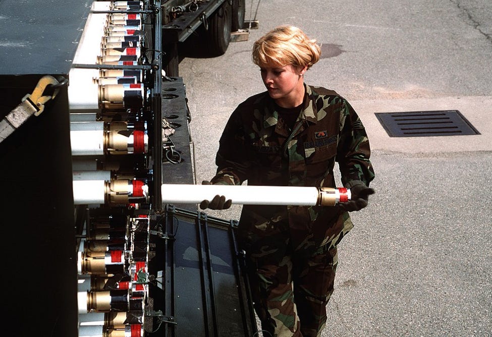[Diversity Photo, 30 years ago, almost! A Senior Airman of the United States Air Force inspects 70 millimetres (2.75 in) white phosphorus marker rockets at Osan Air Base, South Korea, in 1996.]