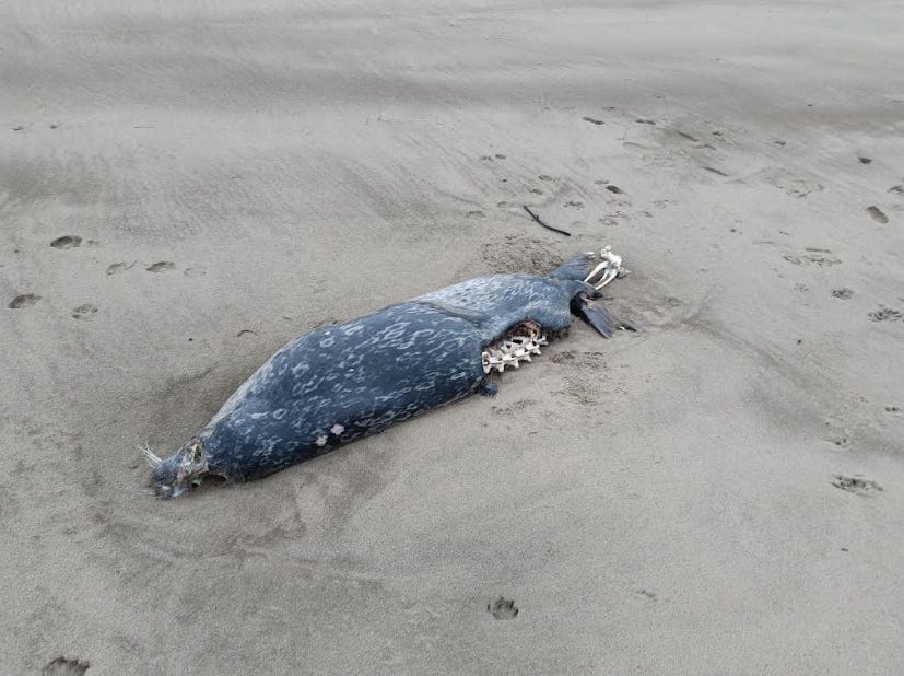 There were 70 crows around this female, for sure, and they were not picking at the animal carcass en mass. In fact, there was a dirge, sort of, and a gull was chased away by corvids from the easy pickings. No vultures yet in our skies. Eagles scared shit of the black crows of death. Some dog prints, around the animal, but no humanoid poking about.