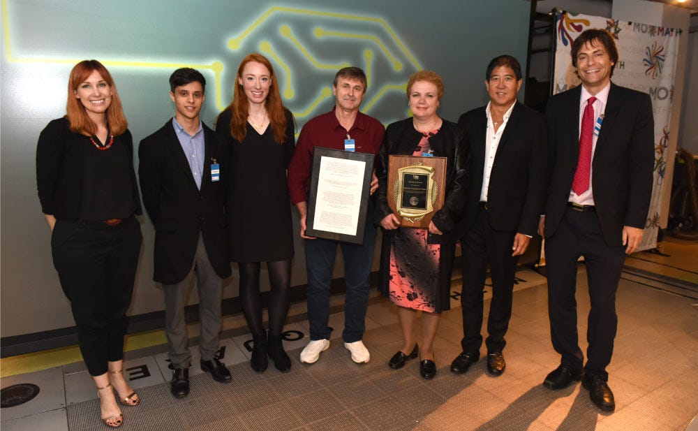 [Stanislav Petrov’s daughter Elena holds the 2018 Future of Life Award flanked by her husband Victor. From left: Ariel Conn (FLI), Lucas Perry (FLI), Hannah Fry, Victor, Elena, Steven Mao (exec. producer of the Petrov film “The Man Who Saved the World”), Max Tegmark (FLI)]
