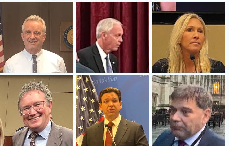 Malone: “I am proud to consider all of them my friends and allies in this fight”. [Senator Ron Johnson, Rep. Marjorie Taylor Greene, Rep. Thomas Massie, Gov. Ron DeSantis and UK MP Andrew Bridgeon.]