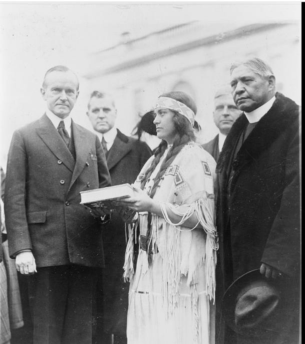 [On behalf of “The Committee of One Hundred”, Ruth Muskrat Bronson presents Gustavus Elmer Emmanuel Lindquist′s book The Red Man In The United States (1919) to President Calvin Coolidge; on the right is Rev. Sherman Coolidge, co-founder of the Society of American Indians, December 13, 1923.]