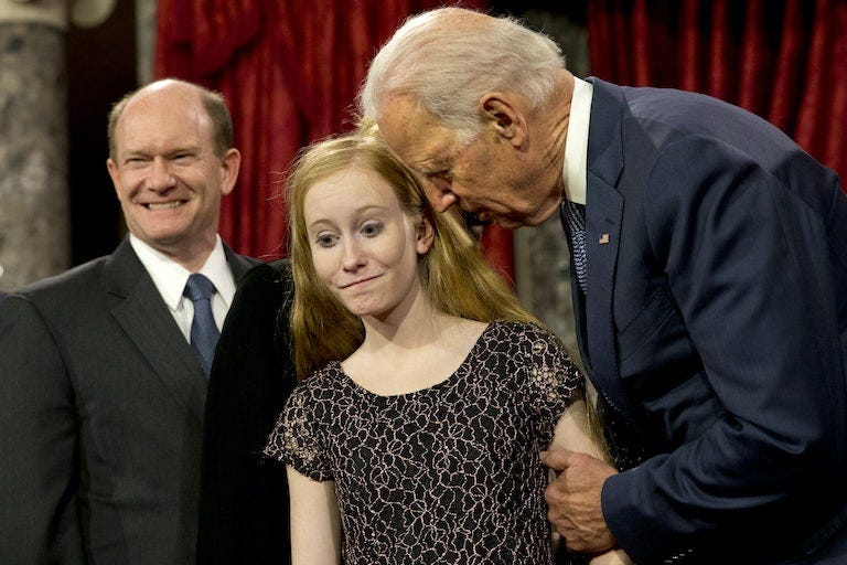 But the cool uncle has become, practically overnight, the creepy uncle. On one level, the driving reason for this is no mystery. Within the past week, two women have accused the former vice president of unwanted touching: Lucy Flores said he kissed the back of her head at a campaign event in 2014, and Amy Lappos said he “put his hand around my neck and pulled me in to rub noses with me” at a fundraiser in 2009. These accusations, coming in the #MeToo era, have prompted a reevaluation of Biden’s history of showing physical affection toward women and girls.