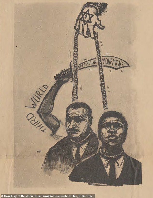 The cartoon, which in the 1967 SNCC newsletter accompanies (above) a feature decrying Israel’s treatment of Palestinians, depicts Muhammad Ali and Gamal Abdel Nasser, at the time the president of Egypt, facing forward with a rope around their necks. The rope is suspended from a hand — either executioner or puppet master — on the back of which a Star of David with a dollar sign at its center has been imprinted or tattooed. Behind the two men, an arm in a T-shirt wields a curved sword; the words “THIRD WORLD LIBERATION MOVEMENT” appear alongside the arm and across the surface of the blade.