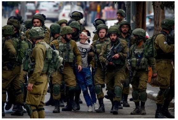 [Now-iconic photo of 16-year-old Fawzi al-Junaidi (c) as he is arrested by Israeli soldiers at a protest in Hebron, December 7, 2017.]