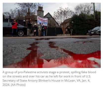 [A group of pro-Palestine activists stage a protest, spilling fake blood on the streets and over his car as he left for work in front of U.S. Secretary of State Antony Blinken’s House in McLean, VA, Jan. 4, 2024. (AA Photo)]