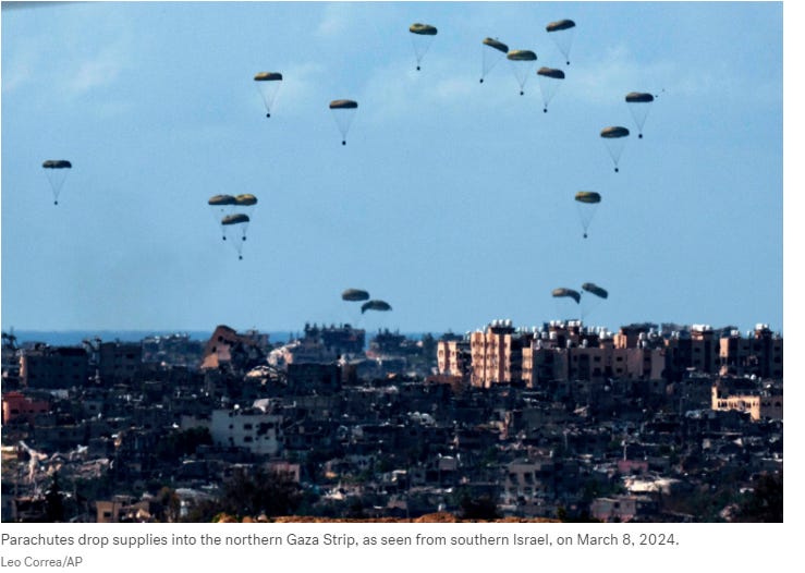 But today we’re getting a picture of why that method is so inefficient and also why it is so dangerous. We’re getting reports today of multiple people having been killed or injured as a result of some of these airdrops in northern Gaza. And that just gives you a sense of how perilous this can be. And it also gives you a sense of the importance of opening up more of these land crossings into Gaza. We heard the president talk about that last night. And reportedly Israeli officials are set to open this week another crossing into northern Gaza, although they haven’t yet confirmed the details of exactly where that will be or how much aid can get in that way.