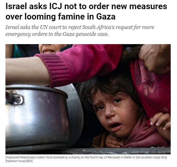 Israel’s response, of course, was to weaponise starvation even further. As Al Jazeera reported yesterday, the settler-colonial state asked the International Court of Justice (ICJ) to refrain from issuing emergency orders as requested by South Africa, describing these as “an abuse of procedures”.