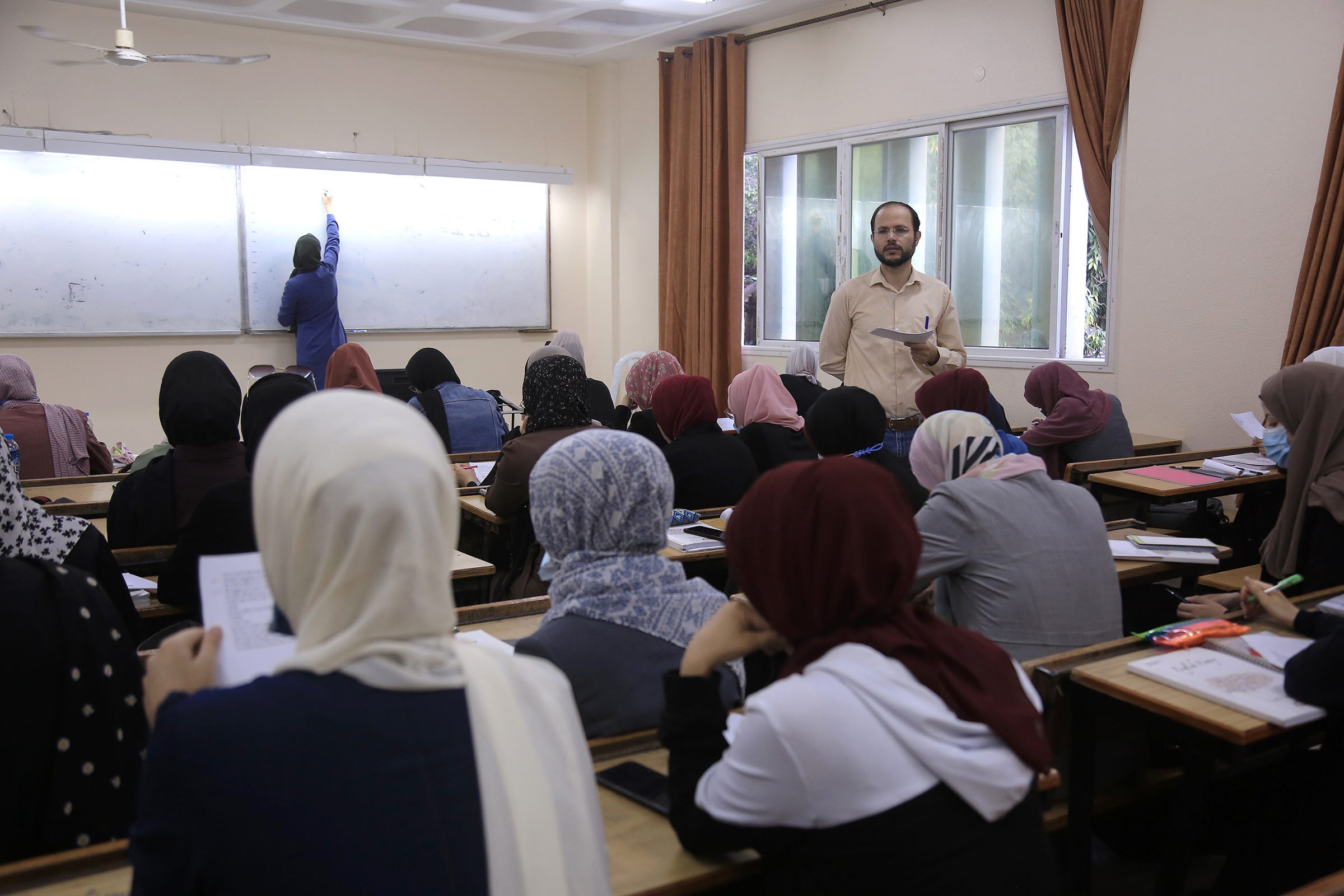 [Professor Refaat Alareer during a lecture to his undergraduate literature students at the Islamic University in Gaza on Oct. 4, 2021.]