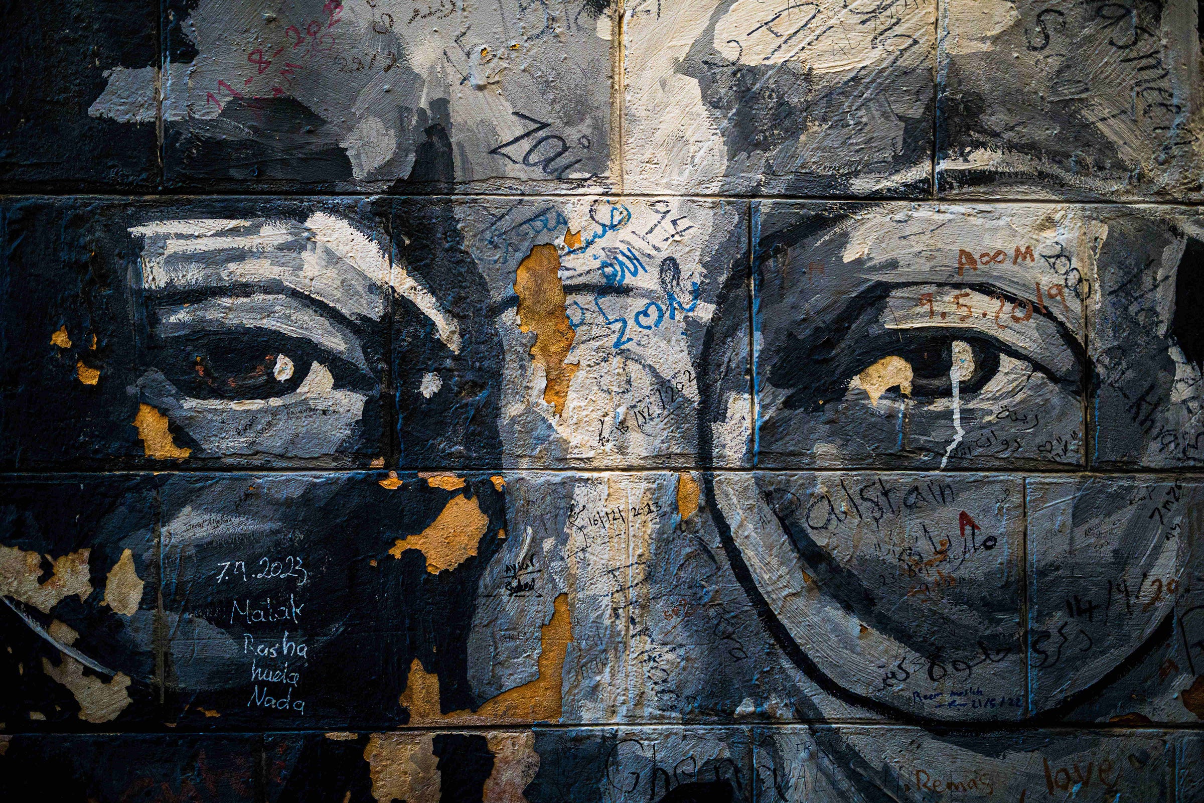 [The eyes of Mahmoud Darwish look on in a mural seen on a wall in downtown Amman, Jordan, on Jan. 5. The late Palestinian author, who died in 2008, was regarded as Palestine’s national poet.Natascha Tahabsem—Zuma Press]
