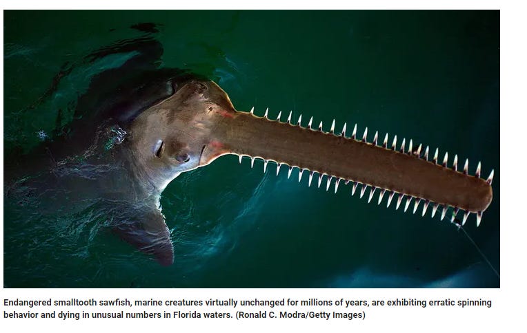 Since late January, state wildlife officials have been documenting what they call an “unusual mortality event” that has affected about 109 sawfish and killed at least 28 of them. There have been reports of abnormal behavior, such as the fish seen spinning or whirling in the water. Other species of fish also appear to have been affected.