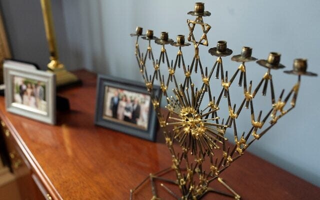 [Photo: Kamala Harris and Doug Emhoff have 3 menorahs, representing Jewish joy and trauma]