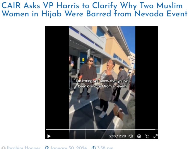 The possibility that discrimination may be at play in official responses to the protest mobilizations against the genocide campaign was highlighted by a recent video that went viral of two women wearing hijabs being denied entry to a campaign event featuring Vice President Kamala Harris in Las Vegas on January 27.
