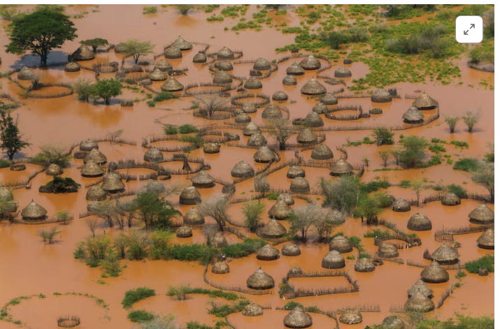 [Photo: An aerial view shows a deserted and flooded traditional homestead following heavy rains in Garsen, Tana Delta within Tana River county, Kenya November 23, 2023]