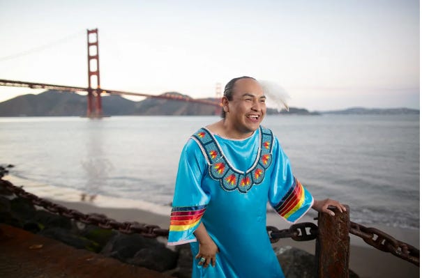 “John had spent his whole life wanting to dance in a woman’s Apache dress, but didn’t feel safe to do so until he traveled to the Bay Area American Indian Two-Spirit Powwow, which I think says a lot about the way that members of the LGBTQ+ community are treated in some of our communities. It’s really important in national conversations about Indigenous identity that we make sure to acknowledge our Two Spirit relatives and create space for representation. And John would want me to share that with you.”