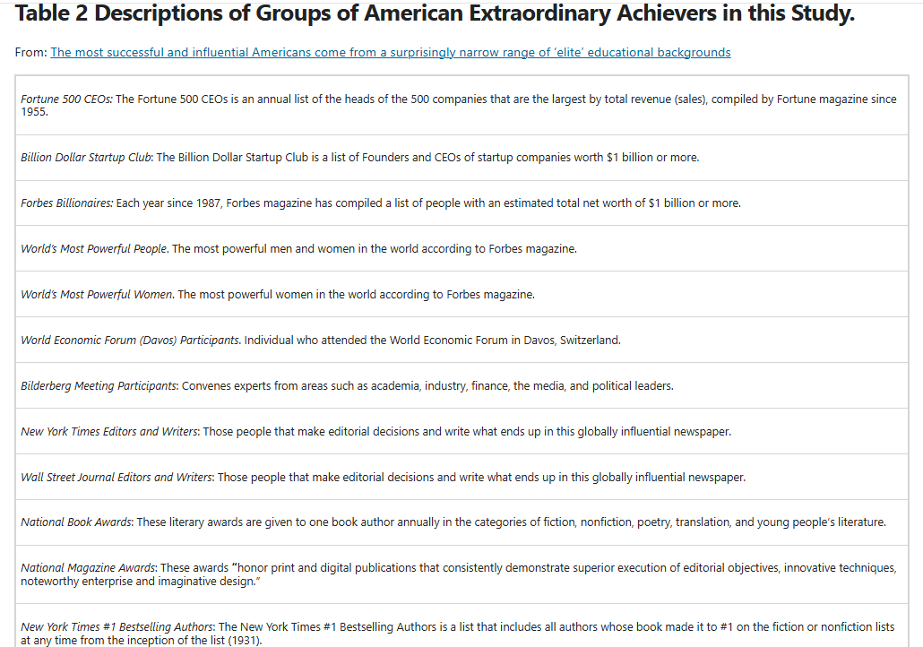 Fucking Poison Penury Polluting Ivy League! In a recent paper published in Nature Humanities & Social Sciences Communications along with colleagues Stephen Anderson, Kaja Perina, Frank C. Worrell and Christopher Chabris, we examined a sample of over 26,000 Americans who came from 30 different groups of influential people, ranging from four-star admirals and generals, presidents and vice presidents, Pulitzer Prize-winners, billion dollar startup company founders, National Academy of Sciences members and Harvard faculty. Across the same set of 34 elite schools, we found that, overall, 54.2% of these individuals had attended one of these schools, and this ranged from 11.2% to 25.9% for the generals, admirals and House members and up to 78.9% to 80.9% for the Forbes most powerful men, Harvard faculty and members of the American Philosophical Society. Overall, 36.3% attended one of the Ivy League schools and 16% attended Harvard.