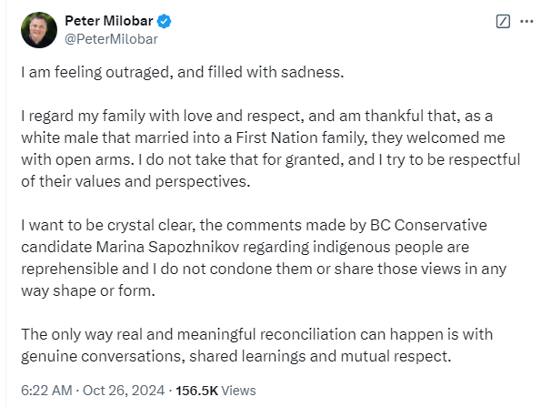 Oct. 29, 2024: During a news conference on Oct. 29, following the final election results, Conservative Leader John Rustad said Marina Sapozhnikov will not be a candidate for the Conservative Party of B.C. moving forward. Rustad called her comments offensive and said they do not represent him or the party.