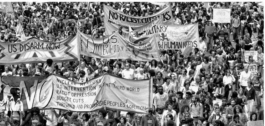 The great African American poet Sonia Sanchez attended the June 12, 1982 peace rally in New York City. After the rally, she wrote the poem, “Reflections after the June 12th March of Disarmament,” published in the collection Homegirls & Handgrenades in 1984. In the poem, Sanchez asked us to not only to call for nuclear disarmament, but to understand the long history of the violence of the “inhumanitarians” that encourages war, destruction, and death: