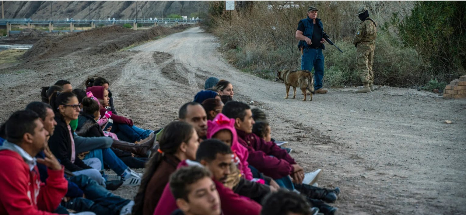 [Propery owner Jeff Allen, rear left, stands with a member of the United Constitutional Patriots near a group of about 30 Brazilian migrants who had just crossed the border at Allen’s property in Sunland Park, N.M., on March 20, 2019]