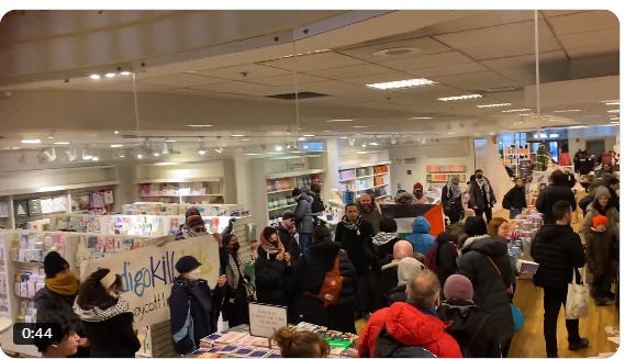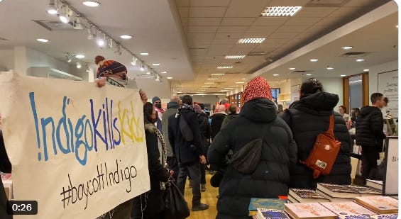 Jews r’ terrible murdering booksellers: Heather Reisman, the CEO of the Indigo bookstore chain, financially supports Israel’s genocidal military. Today, on the busiest shopping day of the year, we went to Indigo’s flagship store in downtown Montreal to condemn Reisman’s complicity in Israel’s heinous crimes.
