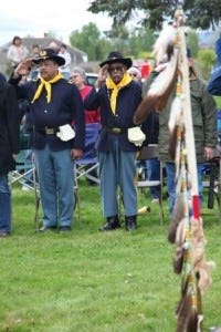 City of Vancouver mayor pro tem was there reading a proclamation of peace and admitting the history of that crime; the dignitaries from the National Park, Boy Scouts, military vets, others. Native Americans, sure, some also combat vets — some old fellows with Korea and Viet Nam logos on leather jackets. A couple of WWII logos. Two African Americans dressed up in Yankee garb — Buffalo soldiers. One was 92 years old.