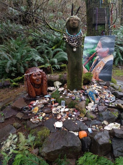 The statue is a tribute to Amanda De-Cuys. In 1864, the blind member of the Coos tribe was wrenched from her daughter and forced by government soldiers to walk barefoot to a prison camp in what is now Yachats. The photo of the flute player is of the now deceased Chief.