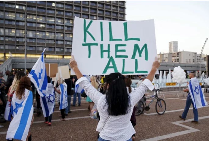Here, don’t get hung up on Hamas and the fucking heroics of Oct. 7, though they should have x-ed them all out, those fucking military fucks at the rave concert: [Photo, 2016! Supporters of an Israeli soldier, Elor Azaria, charged with manslaughter after he shot a wounded Palestinian alleged attacker as he lay on the ground in Hebron in 2016]