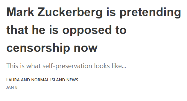 What kind of person is opposed in principle to less censorship? Readers of the New York Times, apparently! One of this site’s readers chuckled about the predictably mortified Times article (“Meta Says Fact-Checkers Were the Problem. Fact-Checkers Rule That False”) being filled with commenters “rending their garments over a prospect of an Internet full of propagandized idiots.” I looked and found a perfect cross-section of upper-class genitorture enthusiasts begging for harder, firmer content domination. The Washington Post headline was nearly as Onion-ish as the Times (“Meta ends fact-checking, drawing praise from Trump,” putting “free expression” in scare quotes in the sub-head), and its nearly 5000 comments were equally revealing. “User generated notes? The prisoners are now guarding the prison!” wrote one Post reader, who apparently sees life as a prison with insufficiently empowered jailers.