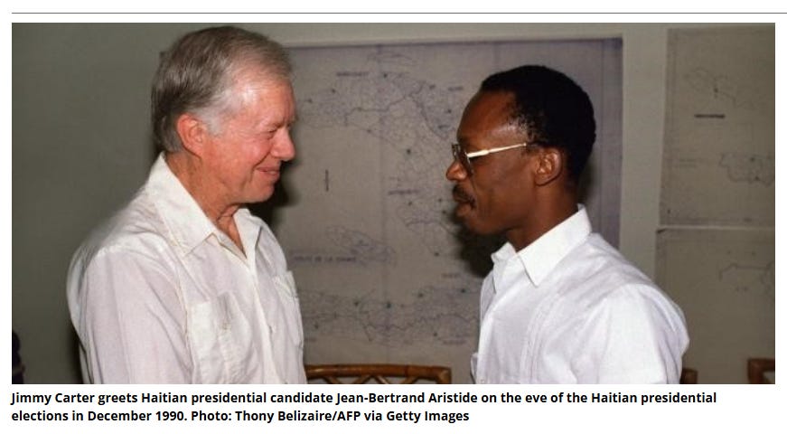 Elections were scheduled to be held in Haiti on December 16, 1990, and Jean-Bertrand Aristide was favored to win. Carter was on hand as an election observer, but he also held meetings at the U.S. embassy, after which he asked Aristide to stand down and to concede before all votes were counted, but he refused and won 67% of the vote. Carter certainly didn’t resolve any conflicts in Haiti. His goal was to get the U.S. backed candidate, Marc Bazin, elected.