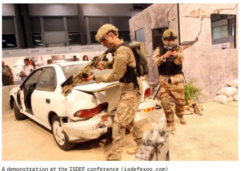 This was not war, but one of the many demos held at the ISDEF expo, an annual June event that attracts thousands of security officials and professionals interested in weapons. Arms fairs in Israel showcase the latest products the profitable Israeli weapons industry manufactures — and the demos are the perfect place to show those products off.