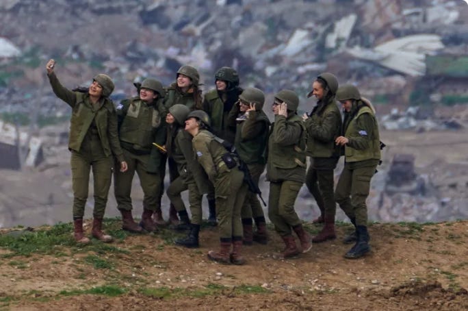 Whores: Israeli female soldiers pose for a selfie overlooking the rubble their army turned Gaza into, on the Gaza border, in southern Israel, February 19, 2024