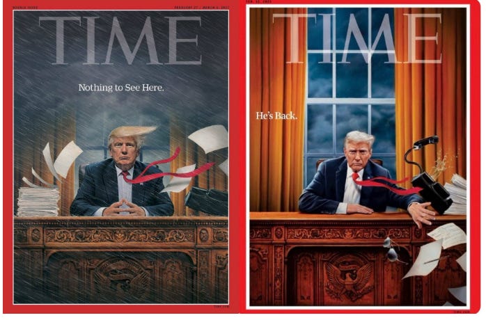 Check out the two TIME Magazine covers. The first from 2017. The second from today. In 2017, the narrative was of a man ignoring all the problems and issues. Idle hands. No concern. Oblivious. Messed up hair. Bad weather beating down inside the office. In 2025, the message is the near opposite. He’s actively removing all remnants of Biden (ed: Biden’s famous aviator glasses seen flying). Focused. Moving. Determined expression and head tilt. In control. Bad weather outside the office, not inside. Same guy. Same agenda, though even more aggressive. Why do you think they have a different perspective?